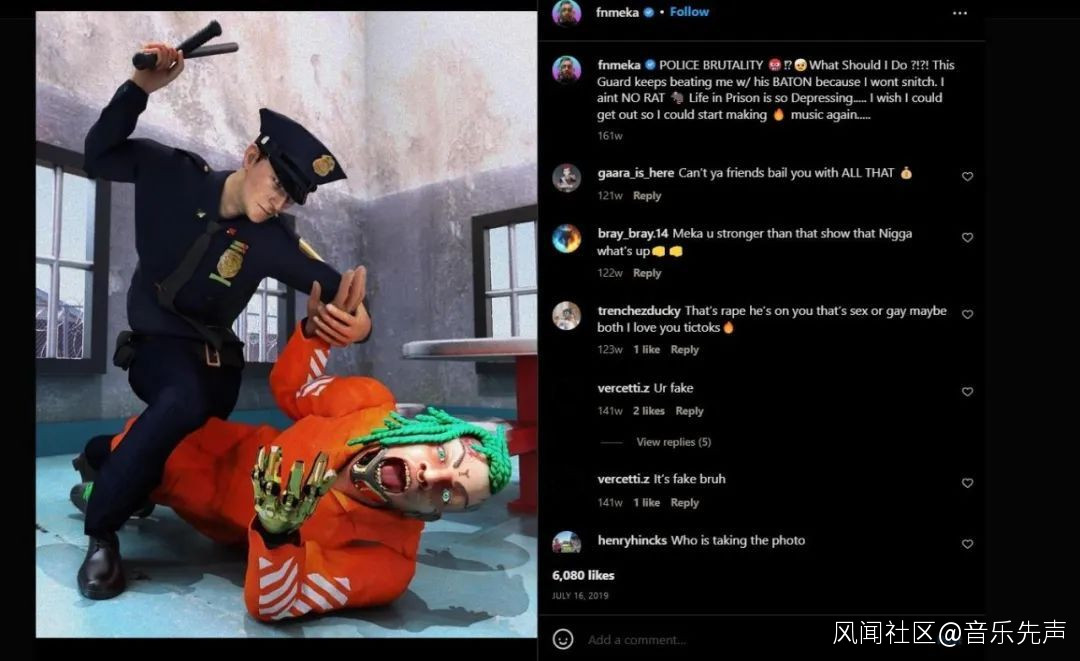 8月23日,Twitter用户公佈了一張FN Meka 在2019年6月發佈的ins頁面截圖,在照片中FN Meka被一名白人警察毆打,直指他輕視了警察的暴行,同樣引發了大量的輿論關注。