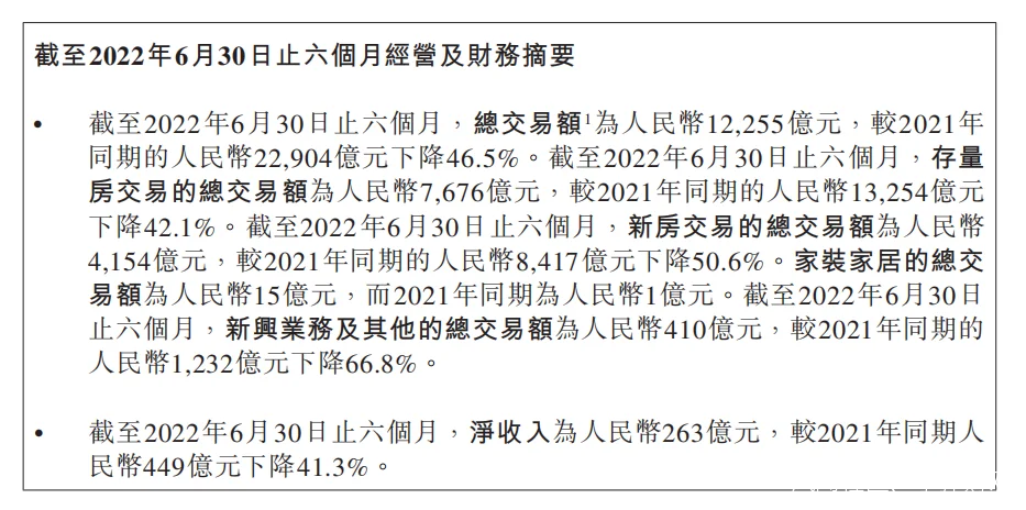 財報顯示,截止2022年6月30日貝殼淨收入同比下降41.3%至263億元;淨虧損約24.85億元,而2021年同期淨利潤21.74億元。經調整淨虧損約5.92億元,而2021年同期經調整淨利潤為31.4億元。