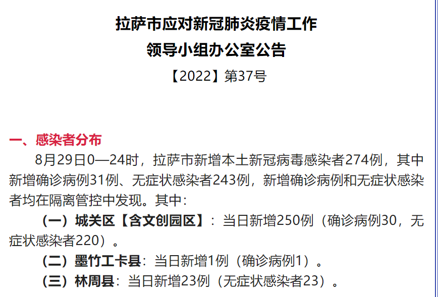 拉薩29日新增本土新冠病毒感染者274例 此前已宣佈基本實現社會面清零****西藏自治區拉薩市應對新冠肺炎疫情工作領導小組辦公室29日發佈公告稱,****拉薩市基本實現社會面清零目標。