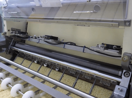 接下來的生產流程是切條折花成型,可以將面片切割成麪條。從這一步開始,方便麪變成了我們常見的捲曲狀。機器切割的麪條會落到下方到無級變速傳送帶。剛接觸面條時的傳送帶速度低,在空中前後搖擺的麪條受到阻力,堆積捲曲成波浪形面層。隨着傳送帶速度增大,麪條被拉開並保留了捲曲的形狀。把麪條生產成波浪形是工廠有意為之,其中好處頗多▼
