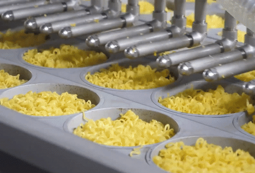 油炸還是非油炸?捲曲的麪條被蒸熟、切斷後,進入乾燥流程。乾燥流程一般分為油炸和非油炸(熱風乾燥),主要目的是去除水分。在這一步麪餅得到定型