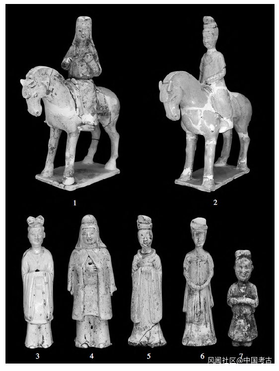 1.賈敦頤墓出土騎馬風帽俑 2.崔大義妻李夫人墓出土騎馬女俑 3.商務中學M9出土文吏俑 4.商務中學M9出土風帽俑 5.崔大義妻李夫人墓出土女侍俑 6.商務中學M9出土女侍俑 7.商務中學M9出土侏儒俑
