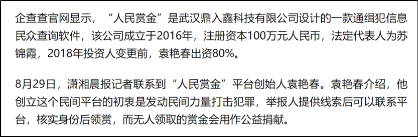 根據企查查和媒體們的報道顯示,“人民賞金網”是一位叫做袁先生的人,本着為打擊犯罪出一份力的初衷,自行創建的。