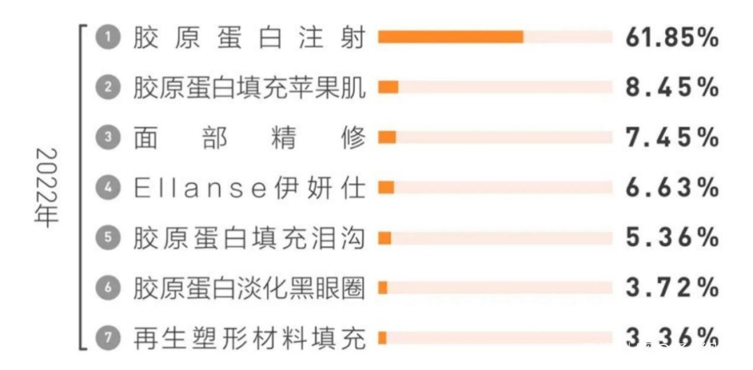 勢頭正猛的膠原蛋白類產品,也將與濡白天使爭奪市場。實際上,醫美填充類產品中,膠原蛋白才是新填充材料的大贏家。根據新氧發佈的數據,2022年1-4月,除玻尿酸以外的新填充材料訂單中,膠原蛋白佔據近80%的市場份額。