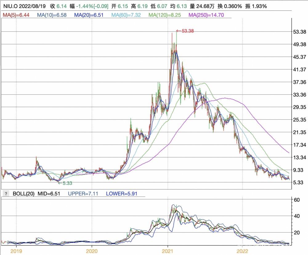 受業績表現影響,小牛電動的股價不斷下行。截止8月19日,股價降幅已達到13.84%。2018年,小牛電動在美股納斯達克成功上市,此後股價一路上漲,並在2021年2月16日時,達到53.38美元的高點,但一年多之後,其市值已蒸發了近9成。