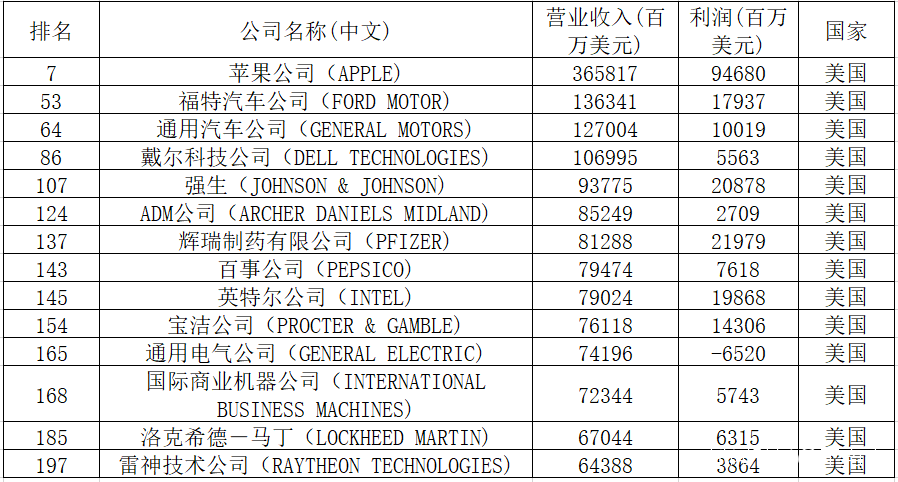 這22家五百億美元俱樂部排名依次是蘋果,福特,通用,戴爾,強生,ADM,輝瑞,百事,英特爾,寶潔,通用電氣,IBM,洛克希德馬丁,雷神,惠普,波音,邦吉,艾伯維,陶氏,特斯拉,默沙東,卡特彼勒。