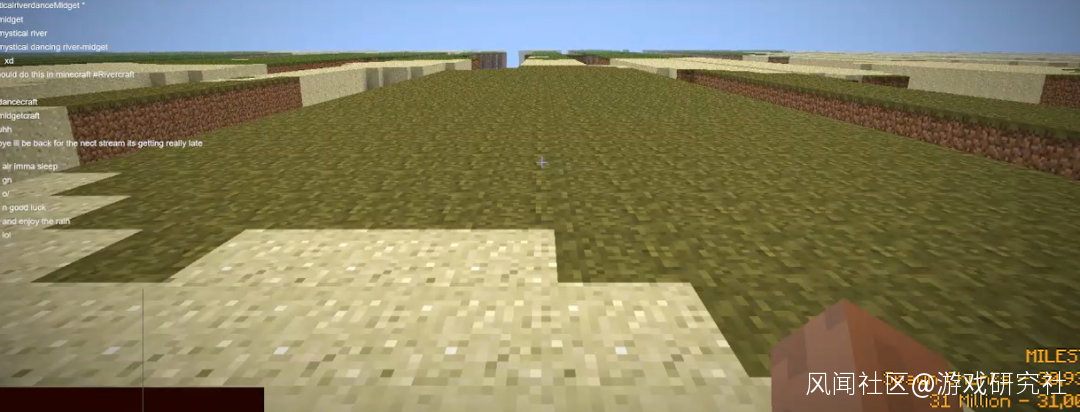 在這局長達一年半的遊戲裏,Mystical Midget每天用着同樣的直播間標題,自始至終朝着X座標軸的方向前進。挑戰的開頭部分與普通的遊戲無異,只是到了後期,遊戲已經乾脆放棄渲染不同的地形,整片地圖呈現出平坦的大道,雖然安全可靠不容易出現意外,卻也少了幾分刺激,他要做的只是連續10小時面對着這樣的地形,放空自己的大腦按着前進鍵。