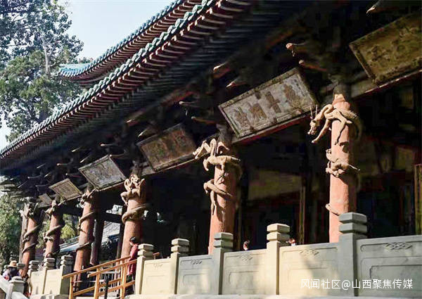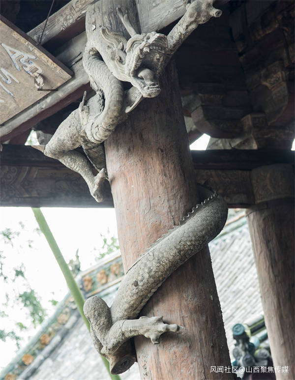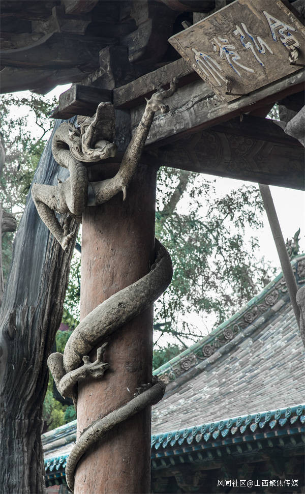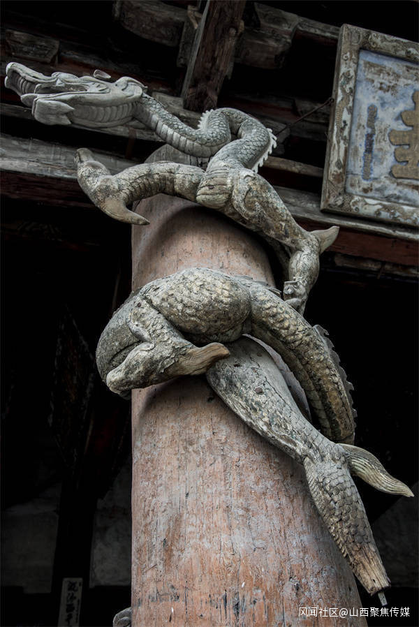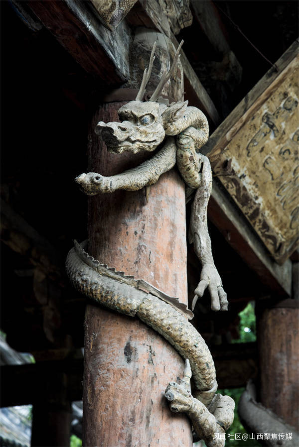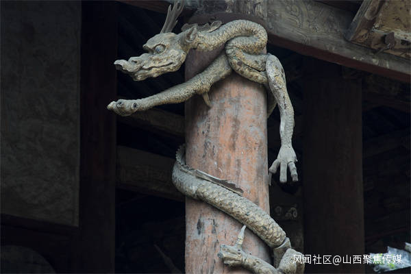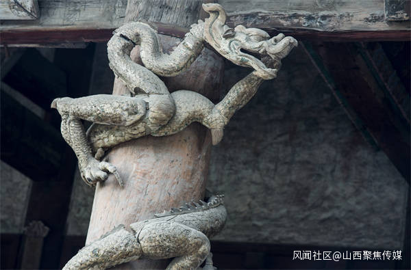 八隻木雕盤龍雖然已快近千年,但仍然紋理清晰,可見當年木雕工藝的精細與工匠的高超技藝。這樣的木雕盤龍正如詩中所描述的那樣,“木雕飛龍似猙獰,中華圖騰巨靈神,俯身懸甕佑聖母,攀援古殿欲重生。”