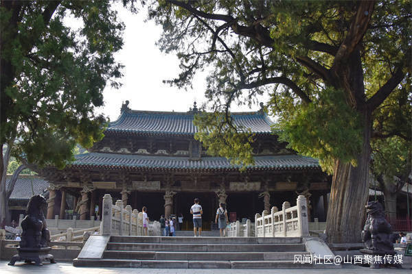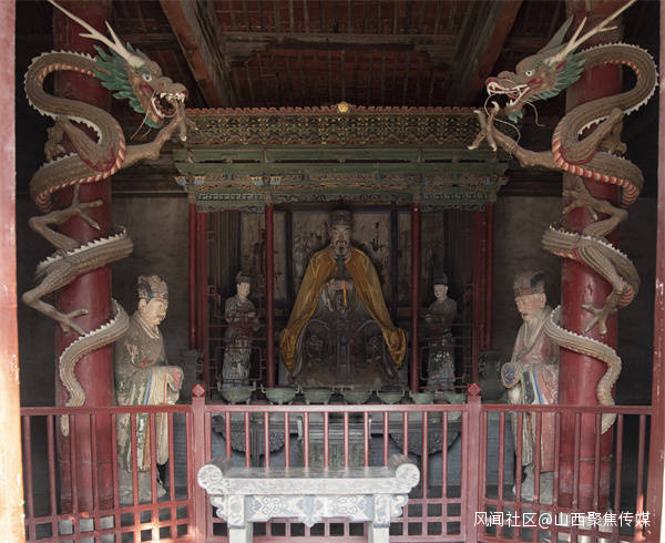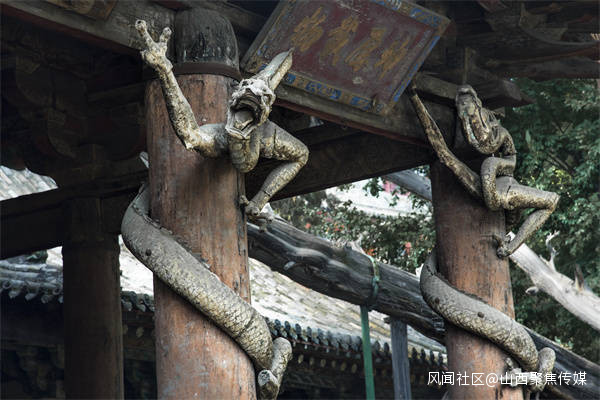 除了聖母殿驚羨的盤龍柱外,與此毗鄰的元代建築唐叔虞祠正殿內,還留存有十分罕見的彩塑盤龍柱,屬最早的泥塑盤龍柱。唐叔虞祠內兩條泥塑盤龍,取材於天地之間的泥士,更加激發了能工巧匠們的創造力,相較於聖母殿的木雕盤龍,這裏的彩塑盤龍的體態則更為健碩。造型更加誇張奔放,這兩條泥塑盤龍,張牙舞爪、粗壯有力、氣勢兇猛,有騰雲駕霧之勢。