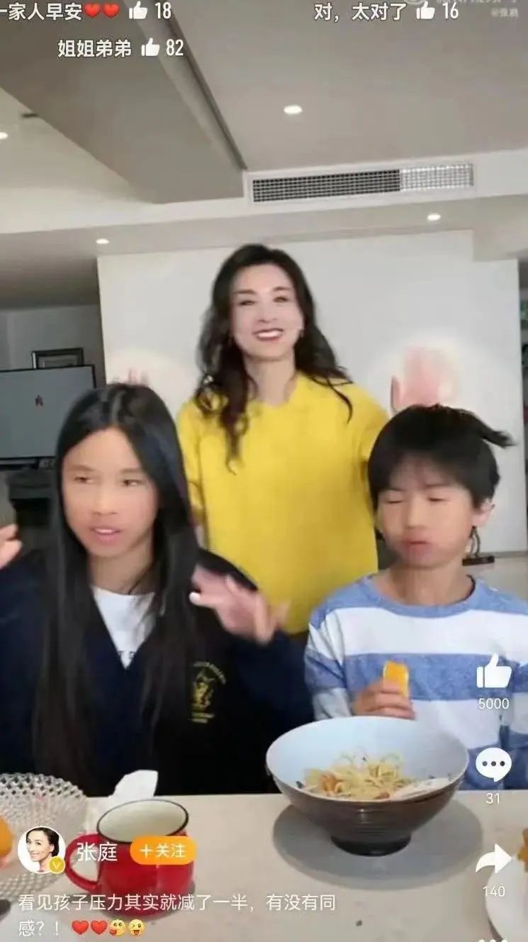 她的一雙兒女出鏡,喝着TST的燕窩、益生菌、膠原蛋白飲料,並對鏡頭喊着“愛媽媽”,張庭説: