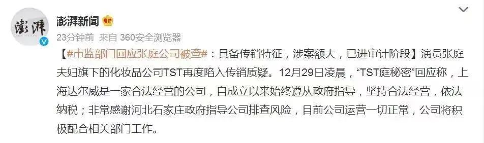 但因為不想自己辛苦發展起來的下線被吃掉,最後只能依靠囤貨來維持業績,走上了一條越陷越深、不斷循環的“死路”。 今年4月9日,張庭、林瑞陽夫婦旗下美妝品牌「TST庭秘密」被認定傳銷的新聞在網上傳開,來自市場監管部門的一紙查處令,叫醒了那些仍處夢中的人。