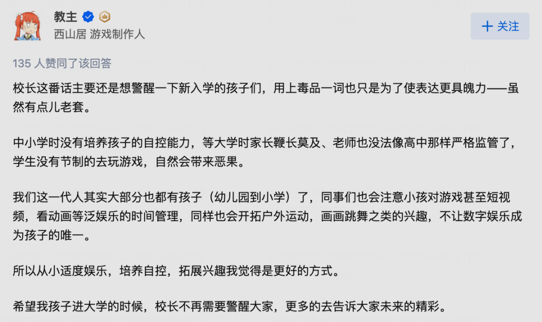西山居遊戲製作人@教主認為,校長這番話主要還是想警醒一下新入學的孩子們,用上毒品一詞也只是為了使表達更具力,雖然有點兒老套。中小學時沒有培養孩子的自控能力,等大學時家長鞭長莫及、老師也沒法像高中那樣嚴格監管了,學生沒有節制 的 去玩遊戲,自然會帶來惡果。從小適度娛樂,培養自控,拓展興趣我覺得是更好的方式。希望我孩子進大學的時候,校長不再需要警醒大家,而是更多 的 去告訴大家未來的精彩。歸根溯源,對於學生而言,“上了大學就輕鬆了”,依然是至今為止廣泛存在於學生學習生涯的論調。在這次的開學典禮上,徐江榮也提到:“上了大學就輕鬆了”是對大學學習的一個嚴重誤判。