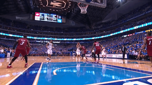 比如這球:雷·阿倫看見勒布朗過來,都已經高拋了,勒布朗還是能靠垂跳轟掉。