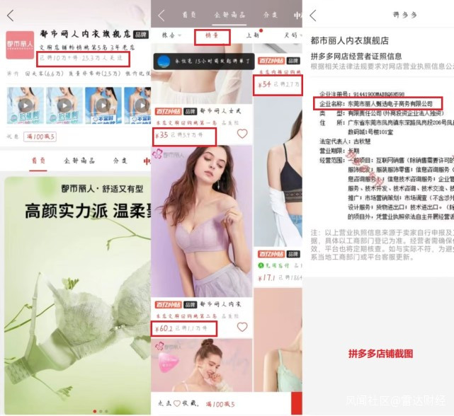 同期,都市麗人內衣旗艦店在拼多多平台的關注量為25.3萬人,店鋪工商信息為東莞市麗人甄選電子商務有限公司(下稱“東莞市麗人甄選”)。在拼多多店鋪中,銷量最高的商品已拼5.9萬件,超過天貓最大爆款銷量。此外,該店鋪還有商品銷量達2.7萬和1.1萬。
