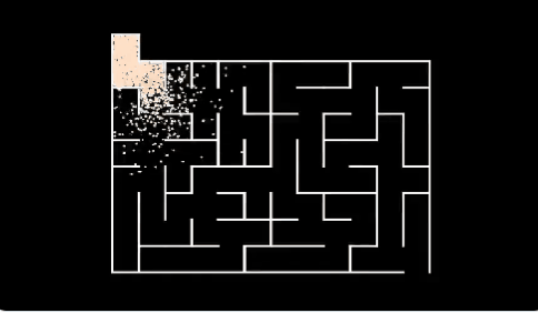 同樣用到 AI 的還有這個老哥的迷宮解法,我願稱呼這個解法為:**AI 無頭蒼蠅養蠱解法。**老哥在電腦上模擬了數千個粒子擴散的模型,讓粒子們在迷宮中無限循環的亂竄,直到有一個黃色粒子找到了走出迷宮的路線為止。