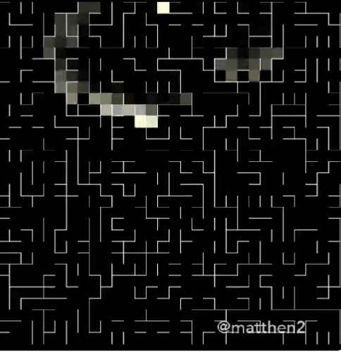 這位老哥用物理引擎模擬了無數道閃電穿梭在迷宮內部,當閃電觸及到不導電的牆體之後,就自動消失了,直到有一道閃電成功從入口順利通往出口。