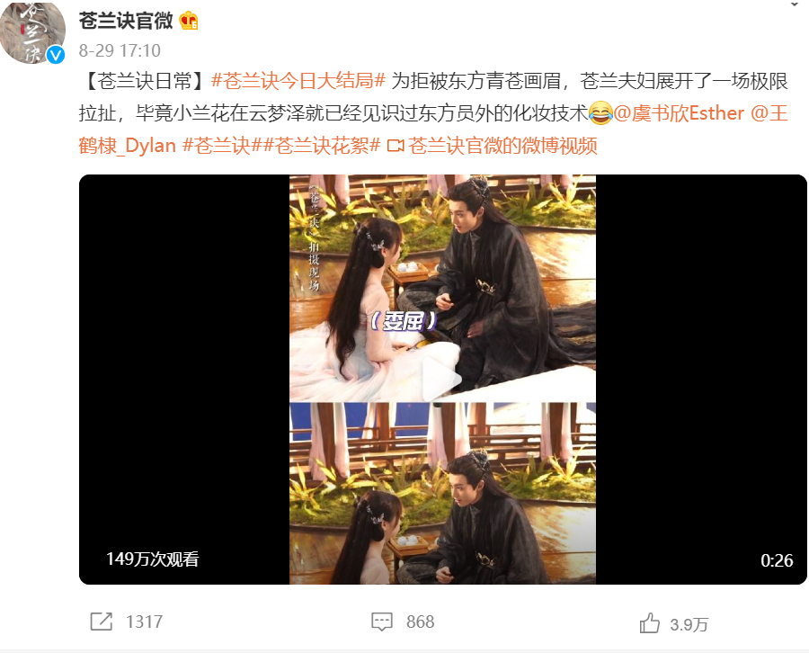 此後,劇組持續釋出一系列雙人花絮。兩人也在那次不歡而散的雙人連麥直播後,線下合體再做了一次直播,並笑着約定“今天不吵架了”。截至發稿前,棣欣引力的超話粉絲已達16.8萬,總閲讀量超8億。