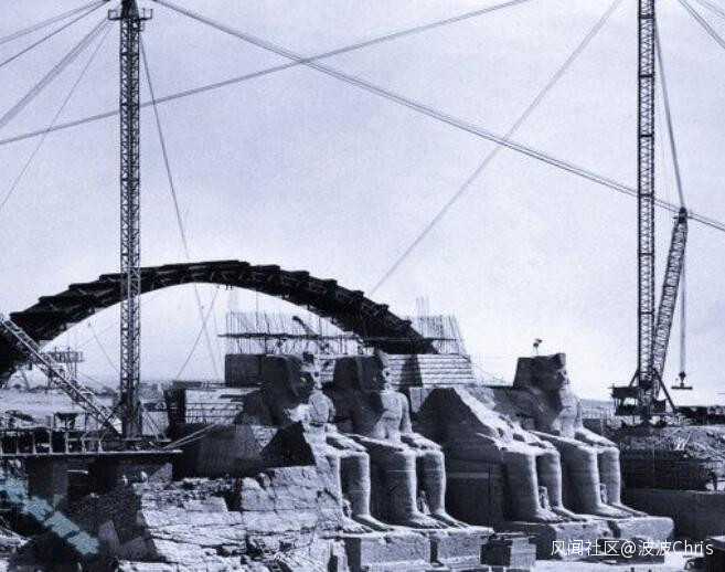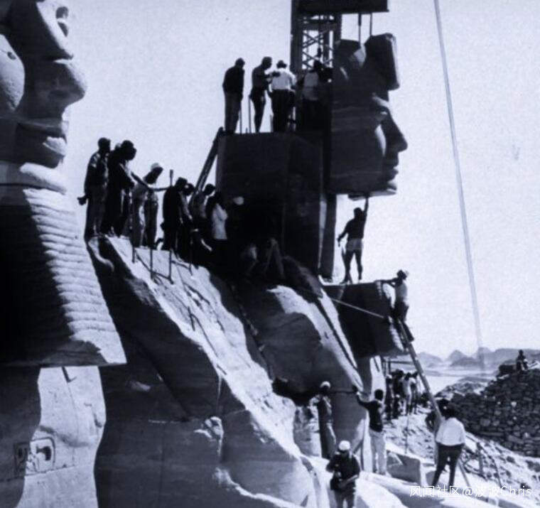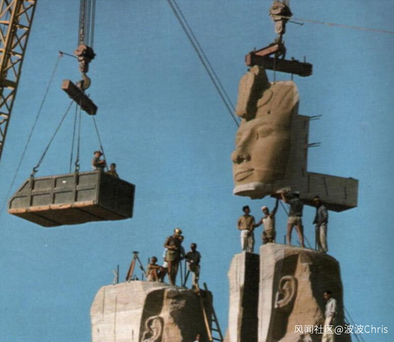 他們帶來了一個相當大的施工團隊和大量工程器械,將當地河岸的巖壁炸碎、剝落並均勻地推入尼羅河,以免形成明顯阻滯河水的壩體被後人看出偽造的痕跡。他們帶來了3萬多噸的混凝土,高效地澆築在破開的山壁上,以構成高約30米,寬約36米,縱深約60米的大神廟,又在大約50米以外澆築了大神廟五分之一體量的小神廟,還有大大小小幾十個雕像。他們運用了相當準確的天文學知識和建築學知識,使得****每年2月21號和10月21號兩天,清晨的第一縷陽光能射入神廟最深處最幽暗的地方,且只照亮裏邊擺放的四座神像中的三座。他們提前設計了三套符號不同又能互相印證通譯的文字系統,命名為“聖書體”、“僧侶體”、“世俗體”,憑空編了許多關於拉美西斯二世和埃及神話的語句,並用聖書體印在了澆築的神廟上。這些編造出來的文字體系還與希臘語、波斯語可以通譯,以便二十多年後讓商博良可以假裝破解。他們在短則幾個月,長可能數年的工期內維持了從最近的大城市阿斯旺到造假現場長達200多公里的補給線,並且買通了每個參與、聽聞此事的當地人不將他們在此施工的事情外泄(也可能是殺光了所有當地人)。在神廟和雕像澆築完成後,他們將其中一個拉美西斯二世雕像的頭肩處炸塌在雕像腳下,並**推動了幾萬噸的沙子將造假現場掩埋,**只剩神廟的門楣和雕像的部分頭部露出來,偽裝成遭遇地震被自然破壞,以便十多年後被瑞士探險家約翰·布克哈特假裝發現。他們最狡猾的地方在於,當時法國人只佔領了下埃及,對上埃及鞭長莫及,而且從攻入埃及到敗退回國只有三年多,之後土耳其和馬穆魯克又恢復了對埃及土地的掌控。在這種情況下跑到1000多公里外的上埃及偽造遺蹟,就能給人造成一種“造假時間不夠”的錯誤印象,減少被質疑的可能性。更重要的是,由於當地人口少、長期動亂,掩埋假遺蹟的沙子直到100多年後的1900年代才被慢慢清理掉,使得假遺蹟得以“自然舊化”,可以欺騙其他不明真相的後來者。更有甚者,到了1960年,埃及計劃在假遺蹟下游的阿斯旺河段修建大壩發電站,這導致中上游水位迅速上漲。聯合國教科文牽頭各種西方專家到偽造的阿布辛貝神廟實地勘察,發現神廟很可能要被淹沒,於是近現代西方造假埃及文明的高潮出現了——他們居然將這組原本就是偽造的神廟建築羣,切割成了2000多塊,分開搬運到更高的山坡上然後重組!整個工程花了四年多時間,有65個國家派專家、工程人員參與施工,還把施工照片發得滿世界都是,全然一副混不吝不怕被人識破的架勢,可見西方文化霸權之可怕,讓那麼多人在施工期間噤若寒蟬不敢説一句“這是混凝土假造的”。