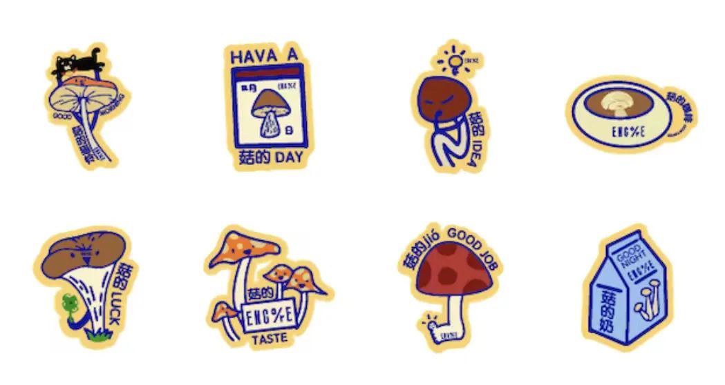 2、把菇諧音成good,上架表情包這一季菇的主題,諳客咖啡在貼紙設計加入了諧音梗,把菇諧音成good。於是就有了菇的JOB、菇的TASTE、菇的咖啡、菇的IDEA、菇的貓寧等一系列的形象,還在微信上架了表情包。