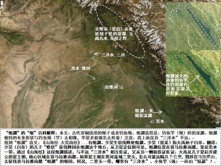 緡淵意思是:釣魚竿(繩)樣的深淵。看上圖,“緡淵”獨特的長條形狀與釣魚繩(竿)太相像,感嘆華夏老祖取名真的太形象!注意:離上面昆吾“三澤水”不遠。 找到“緡淵”意義:《山海經.大荒南經》…有緡淵。少昊生倍伐降處緡淵。 少昊(役採)指大禹孫子白帝。翻譯上段話:少昊(白帝)的兒子“修倍”征伐降國在緡淵這個地方。 從衞星定位圖可見,緡淵位置在喜馬拉雅南麓,靠近若水一帶。通過《山海經》這段緡淵描述,與不遠“三澤水”相互佐證,又從另一側面鐵證佐證:大禹及兒子夏後開建立的夏王朝,核心區域在喜馬拉雅南麓。其孫子役採(白帝少昊)的兒子**“修倍”曾經在緡淵這一帶徵伐緡國。** 試問眾多專家教授院士大權威:如果夏王朝在黃河流域二里頭,怎麼可能遠隔幾千公里,翻越喜馬拉雅山,去征伐喜馬拉雅南麓“緡淵”的緡國。何況,**二里頭一帶,哪裏有“三澤水”、小魚竿(繩)一樣的“緡淵”?****另外,此考證就錯了一個歷代流傳史實繆誤:打開百度百科,對白帝少昊的解釋是:少昊,華夏人文始祖,遠古時期部落聯盟首領稱號,黃帝的長子,母為嫘祖(一説女節 [5] )。少昊,亦作“少暤”,名“摯”,又作“質”,號“金天氏”、“窮桑氏”或“朱宣氏”,生於窮桑,和太昊伏羲一樣同為上古時期東夷族的祖先和首領,因修太昊之法,故稱之為少昊,姬姓 [15] ,一説為嬴姓。進一步解釋:少昊,中國上古傳説首領,五帝之一,黃帝長子,生母嫘祖(一説為方雷氏女節)。有學者認為,黃帝出自泰山地區的大汶口文化,出自泰山部落集團,也是後來所説的東夷人,是少昊的後人,在向西部的發展擴張中,與炎帝等部落相互融合,主宰了中原地區,形成了華夏民族主體;華夏民族的泰山崇拜,説明其文明一支主幹發源於泰山腳下、黃河之邊。 通過“緡淵”位置得確定,與之關聯的緡淵、“緡國”被夏禹的孫子役採(少昊.白帝)的兒子“修倍”征伐滅掉的史實進一步佐證:夏王朝的核心區域離“緡淵”不遠,就在這一帶。看地圖,緡淵的位置正好離“三澤水”、“克什米爾”不遠。同時也糾正上述説法有關“白帝少昊”的真實身份。**看到下面《山海經》給少昊白帝的身份定位: 《山海經.大荒北經》:……有毛民之國,依姓,食黍,使四鳥。禹生均國,均國生役採,役採生修鞛,修鞛殺綽人。帝念之,潛為之國,是此毛民。