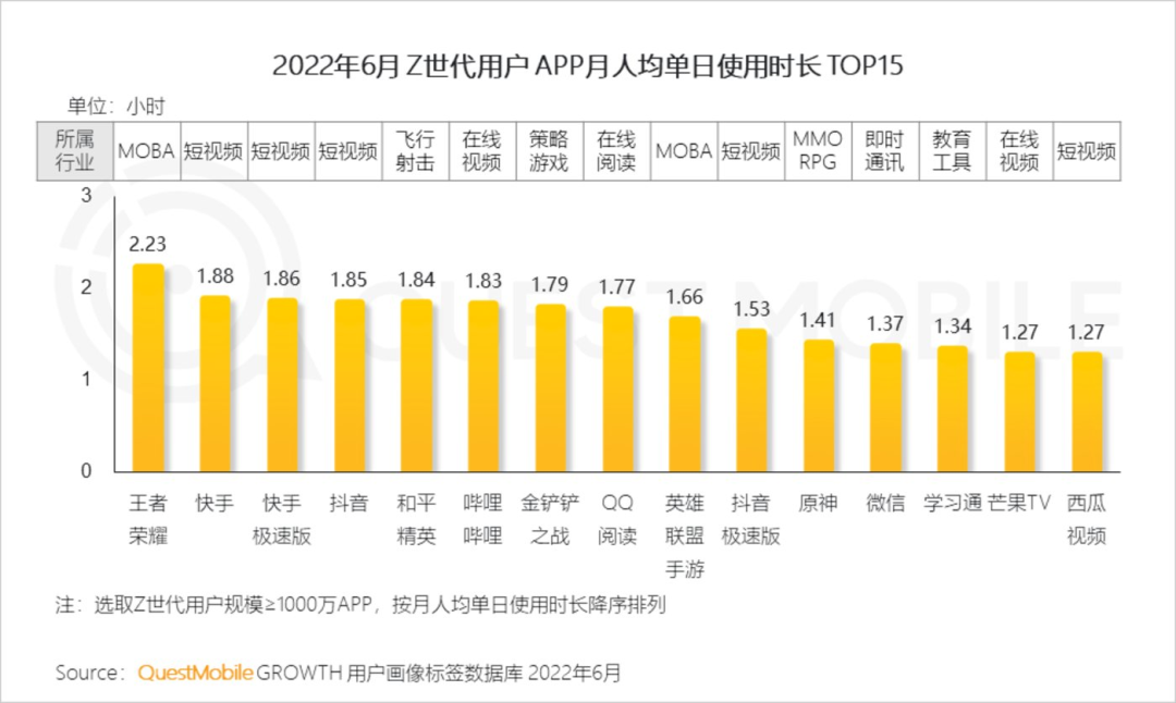根據QuestMobile發佈的《2022 Z世代洞察報告》顯示,Z世代用户APP月均單日使用時長的前15名中,快手、快手極速版僅次於《王者榮耀》,位列第二、第三,領先於微信、抖音、B站等一系列社交和內容產品。