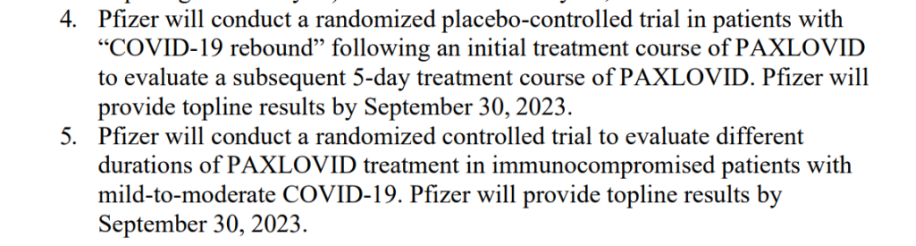 隨着案例數量不斷增加,今年8月,美國食品藥品監督管理局(FDA)已要求輝瑞公司調查該藥物的第二個五天療程是否會阻止病毒復發,並且必須在2023年9月30日之前拿出第二療程抗病毒藥物隨機對照試驗的初步結果。