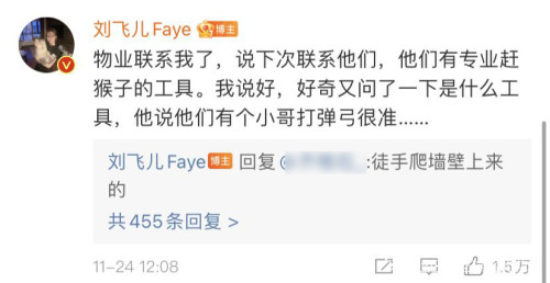 順便提一下,@劉飛兒Faye 去年也發過一個視頻,説自己住在30樓,但家裏卻闖進了猴子,這件事還上了新聞。
