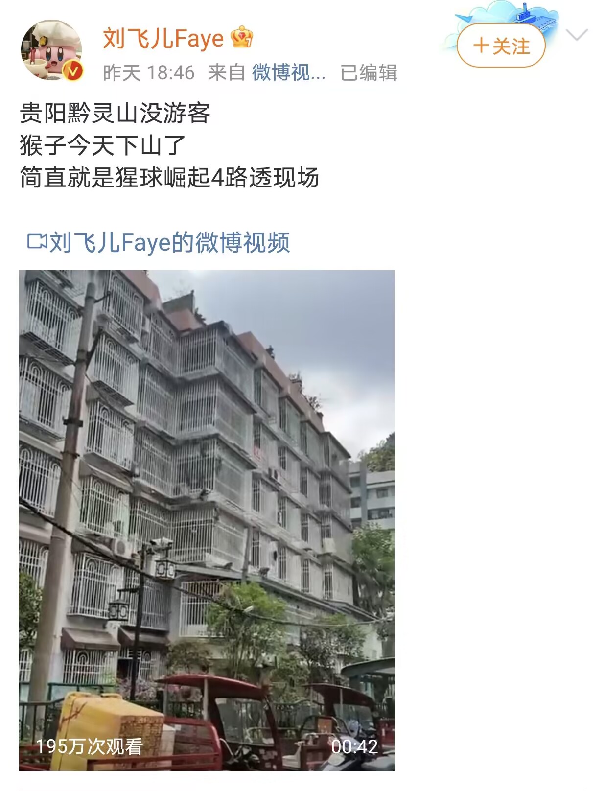 當時@劉飛兒Faye 發文説,我家住三十多樓(天宮,離黔靈山也非常遠。我廚房的窗子留了一個小縫透氣,猴子拉開窗子就進來了。我正在卧室睡覺,一直聽着客廳有聲響,我還以為是我的貓狗在打鬧。但是聲響越來越大,還有很多瓷器碎了的聲音,我這才起牀查看。