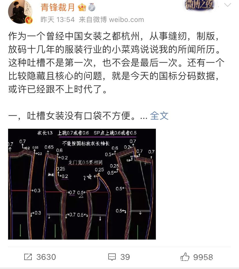 一位從事縫紉,製版,放碼十幾年的服裝行業的博主@青鋒裁月 解釋説,今天的國標分碼數據,或許已經跟不上時代了。