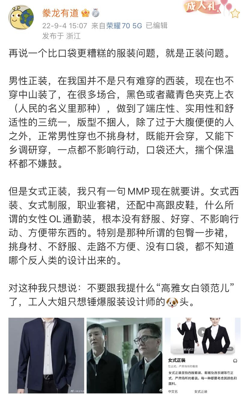 但反觀女式症狀,根本沒有舒服、好穿、不影響行動、方便帶東西的。特別是那種所謂的包臀一步裙,挑身材、不舒服、走路不方便、沒有口袋,都不知道哪個反人類的設計出來的。