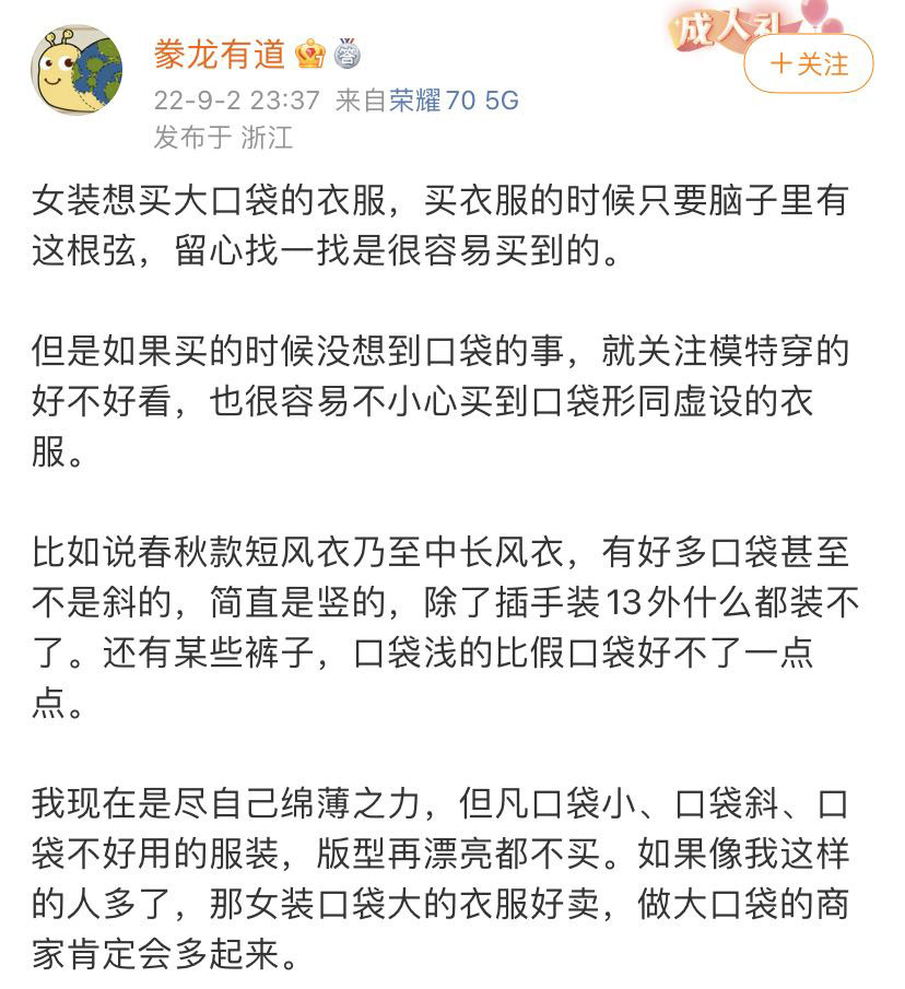 但根據這位博主的需求,那種口袋小、口袋斜、口袋不好用的服裝,版型再漂亮都不買。她希望,像她這樣的人多了,那女裝口袋大的衣服好賣,做大口袋的商家肯定會多起來。