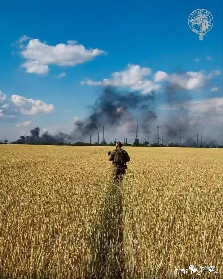 **第三張照片,卻是我今天最感慨的一張照片。**一名全副武裝的烏克蘭士兵,行進在一片莊稼地裏,遠處是爆炸後燃起的硝煙。