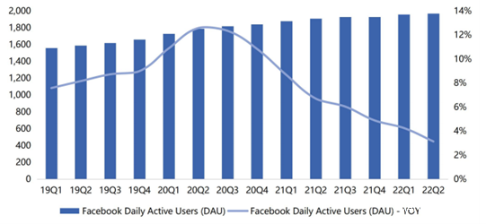 一年就要虧掉100億美元,而近兩年廣告收入又受到影響,導致地主家也沒有多少餘糧了。比廣告收入減少更危險的是Meta在社交領域的成長性正在失速,旗下Facebook用户DAU增速已經放緩。