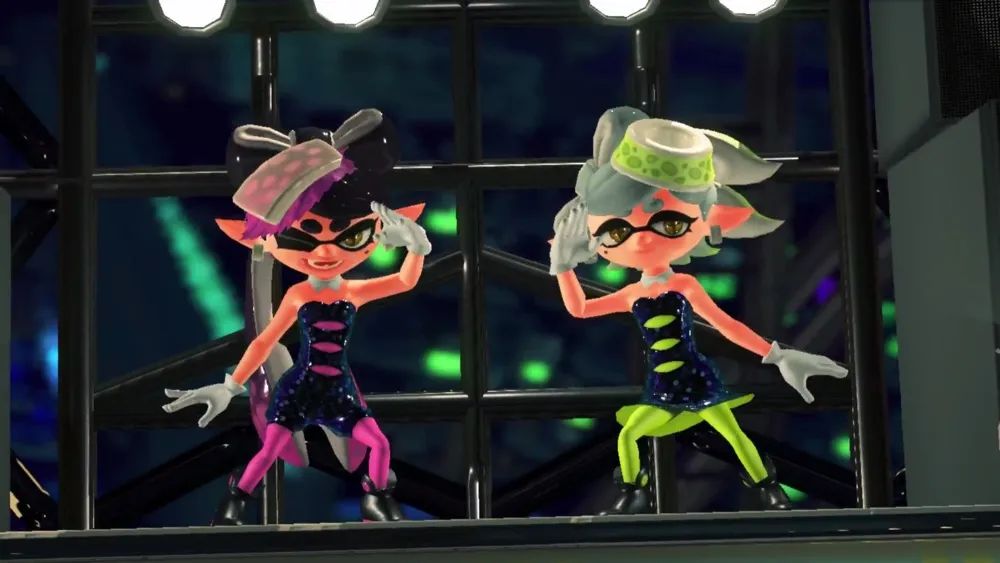設計者還在兩代遊戲中都加入了偶像組合,一代是“潮色姐妹”,二代是“觸手組合”。在玩家每次打開《斯普拉遁2》時“觸手組合”都會率先出現在屏幕裏為玩家播報當前的比賽輪換地圖,還會講幾句俏皮話。