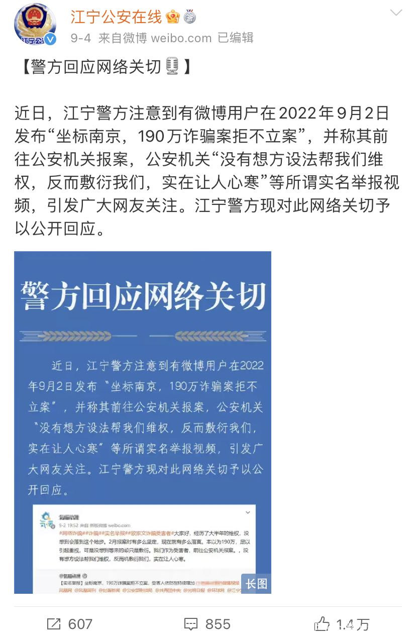 9月2日時@気喵動漫 發文説“座標南京,190萬詐騙案拒不立案,受害人依然在持續增加”。9月4日,@江寧公安在線 公開回應此事。