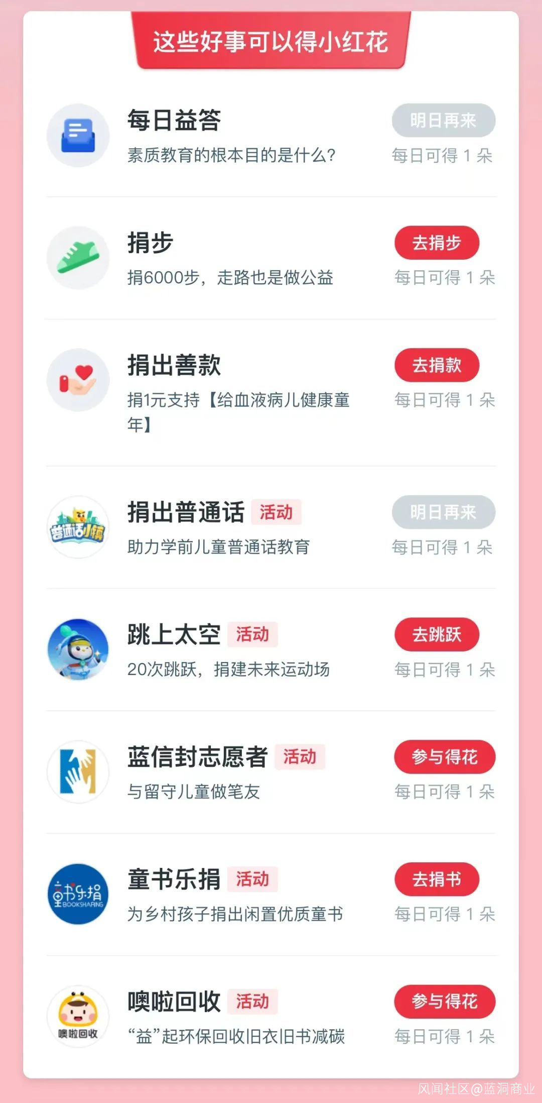 今年是「99公益日自媒體合夥人計劃」的第三年,「藍洞商業」也參加了99公益日自媒體計劃,正式成為公益夢想的「共創者」一員,通過加入#種花行動#,發起「藍洞商業小紅花夢想戰隊」,認領1萬朵小紅花,帶領粉絲們一起捐出賬户上的小紅花,幫助1000名鄉村兒童實現去看博物館。