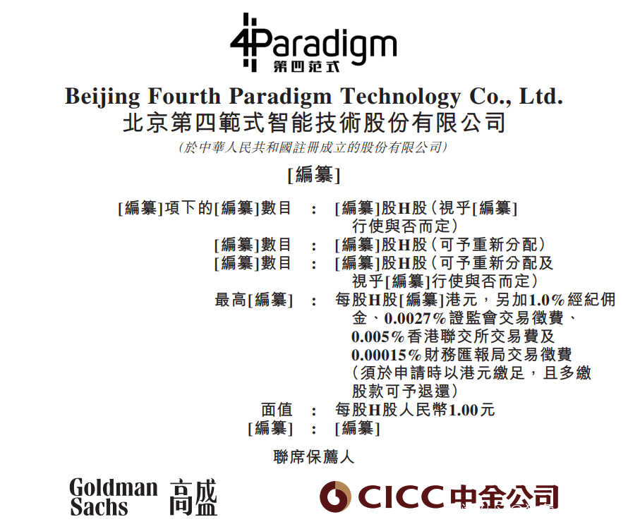 據港交所9月5日披露,北京第四範式智能技術股份有限公司(“第四範式”)向港交所主板遞交上市申請,高盛、中金公司為聯席保薦人。