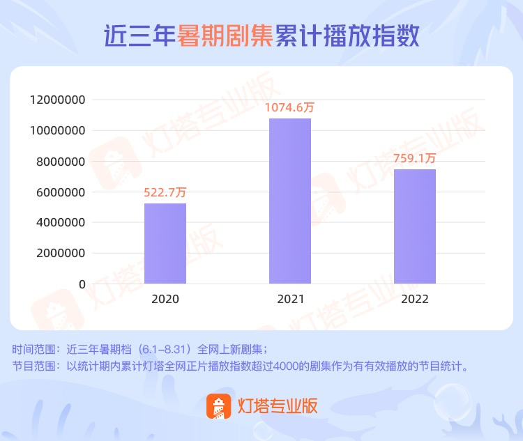 播放方面,2022暑期檔全網劇集正片播放指數759.1萬,同比去年(1074.6萬)減少29.4%;部均正片播放指數10.25萬,同比去年(10.5萬)減少2.6%。
