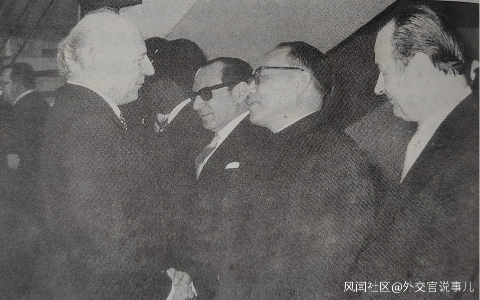 1974年11月,喬冠華副外長訪德時拜訪聯邦德國聯邦議院外交委員會主席施羅德。右一為作者