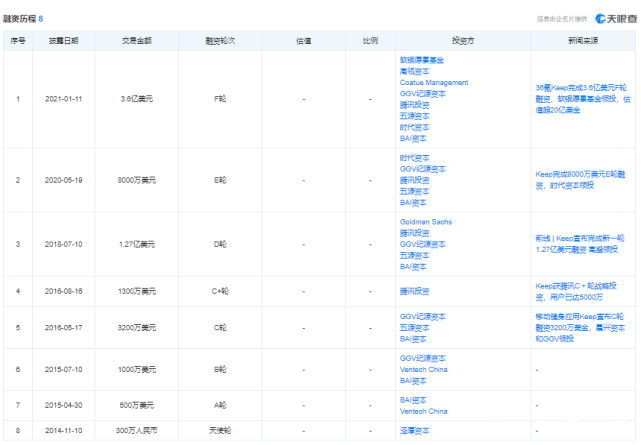 天眼查顯示,自2014年11月起,Keep曾先後獲得過8輪融資,融資金額在300萬元人民幣至3.6億美元不等。2021年1月,Keep完成截至目前的最後一輪融資。彼時,Keep完成F輪融資後,估值一度衝破20億美金,相比其2020年5月E輪融資的10億美金估值翻倍。