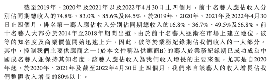 而據招股書分析,其中貢獻最大的“供應商B”,根據合約年限應該是樂華旗下的頂流藝人王一博。從2020年至今年4月份底,王一博分別佔到同期總收入的16.8%、36.7%、49.5%和56.8%,以一己之力驅動了樂華娛樂超80%以上的營收增長。