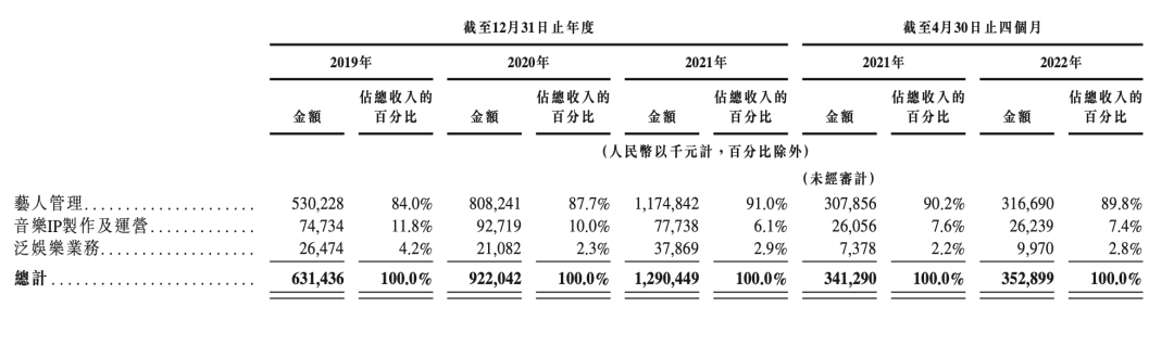 根據樂華娛樂向港交所遞交的招股書顯示,其業務範圍分為藝人管理、IP製作及運營、泛娛樂業務三個部分。但實際上,藝人管理板塊的營收卻呈現獨大的局面。