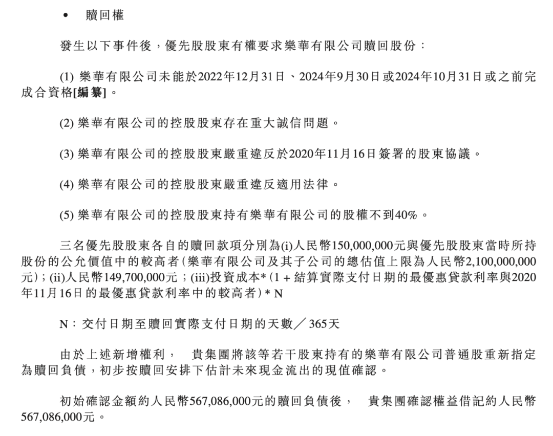 畢竟,根據招股書內容,樂華娛樂也與字節跳動、阿里巴巴、華人文化等優先股股東簽訂了對賭協議,如果在今年12月31日、2024年9月30日或10月31日未完成上市,將面臨優先股股東的鉅額贖回要求。