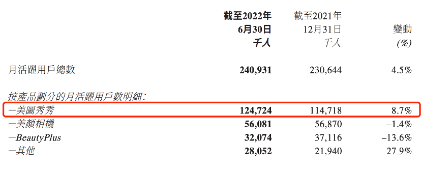 而2022H1月活之所以能夠抬升,主要是由旗下APP美圖秀秀的月活拉昇導致。該節點內,美圖秀秀月活躍用户數達1.247億,環比增長8.7%,有一個較高的拉昇。