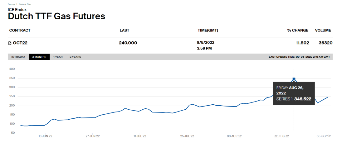 8月26日,歐洲天然氣交易價格達到歷史高點——346歐元/每兆瓦時。