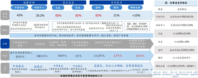 三大細分賽道進入牌照壁壘相對較弱,在政策積極鼓勵社會辦醫的趨勢下准入門檻明顯下降,社會資本與民營活力持續釋放。