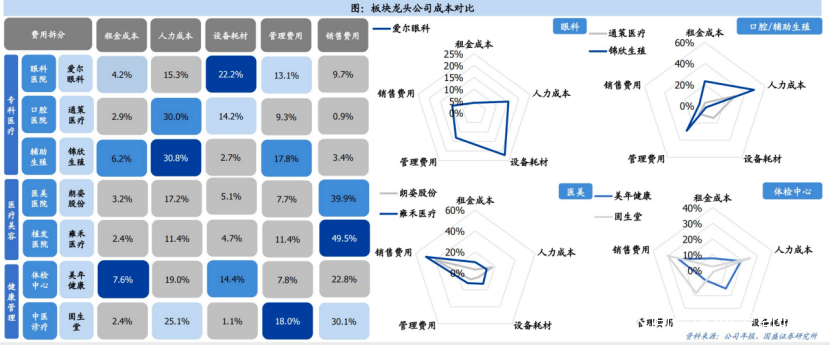 專科醫療終端服務壁壘高築,眼科服務更重設備,精密儀器為治療關鍵,愛爾眼科設備耗材支出佔比高達22.16%,齒科與輔助生殖更重技術,手術治療成功率與效果與醫師資質高度相關,人力成本佔比在通策醫療與錦欣生殖中高達30%+。