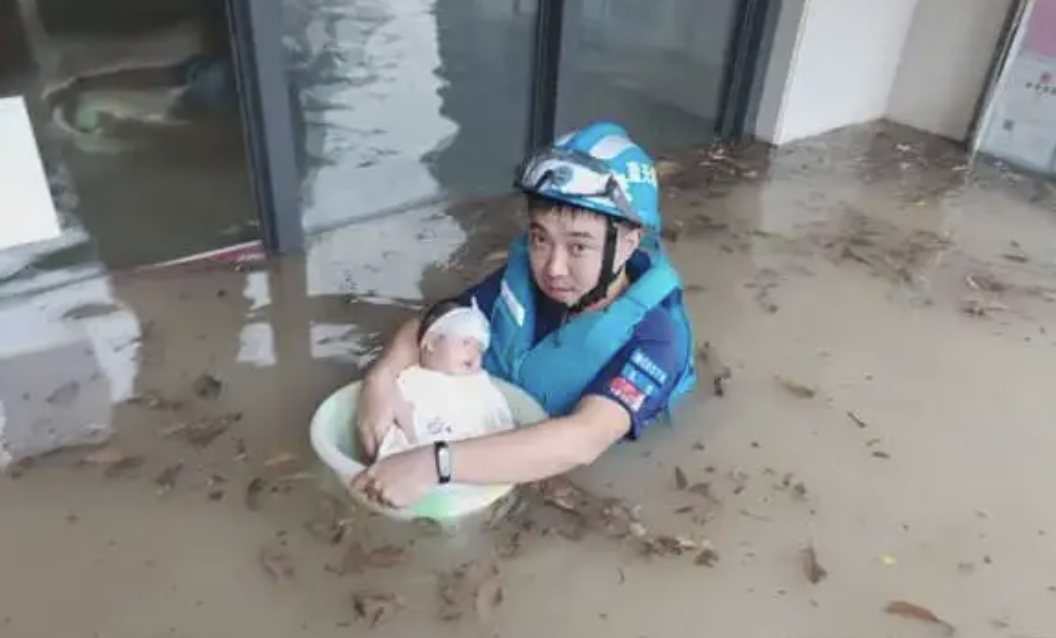 2020年,洪峯過境重慶,主城濱江路被淹。 志願者鑽進泥水中用臉盆救出了3個月大的嬰兒。