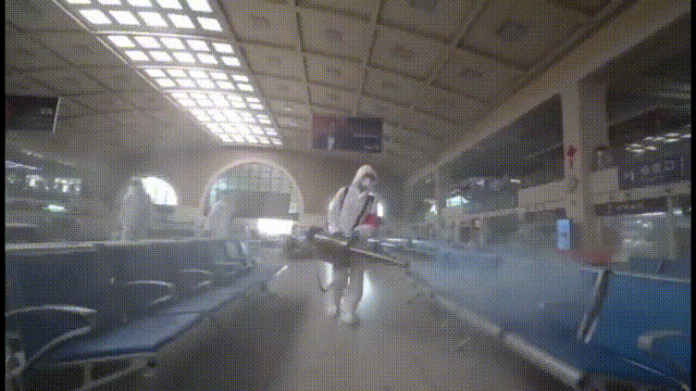 還有不少救援人員,穿着密不透風的防護服,揹着幾十斤重的全套消毒設備,奔走在武漢城市的各個角落消毒。