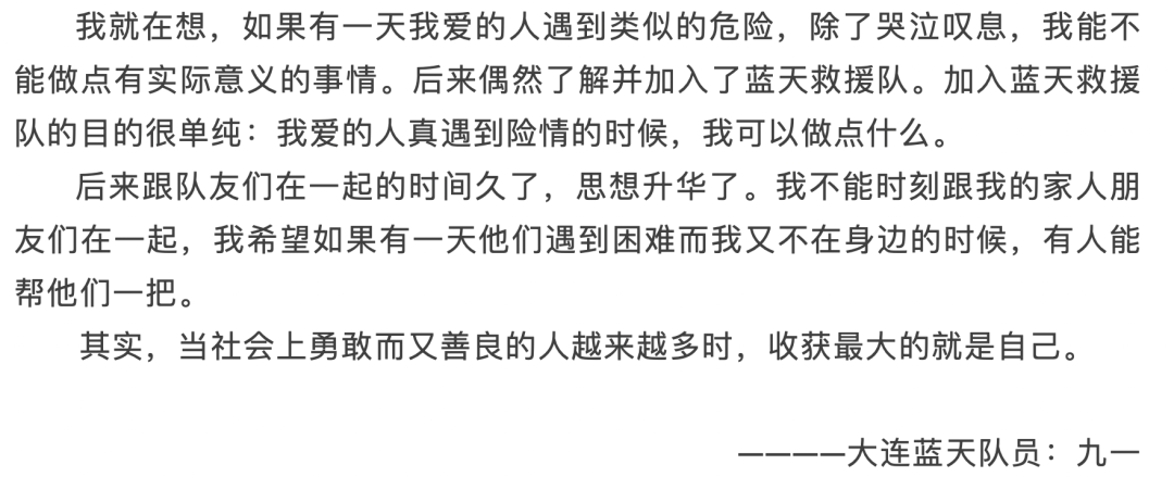 後來他加入了救援隊,目的很單純,「我愛的人真遇到險情的時候,我可以做點什麼」。 再後來,他希望**「如果有一天他們遇到困難而我又不在身邊的時候,有人能幫他們一把」**。